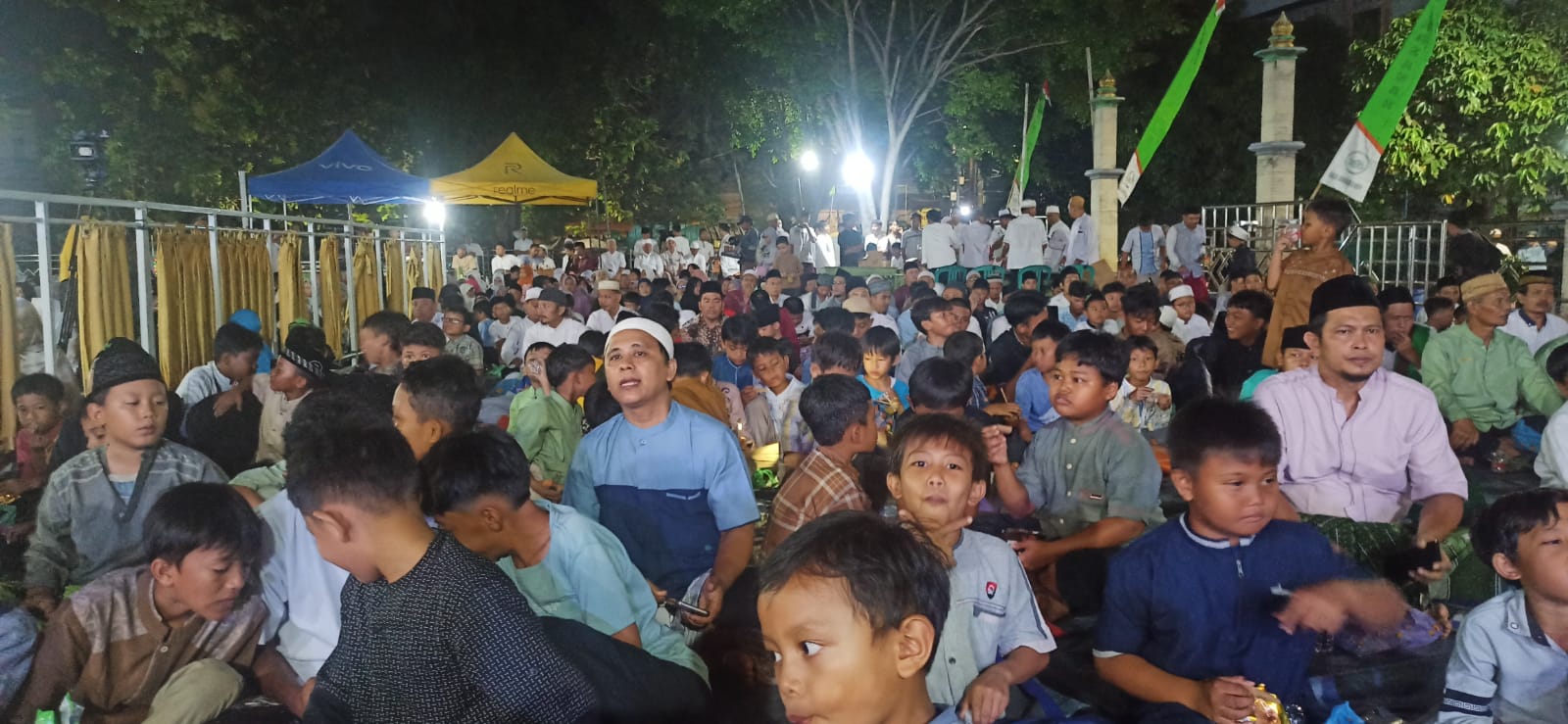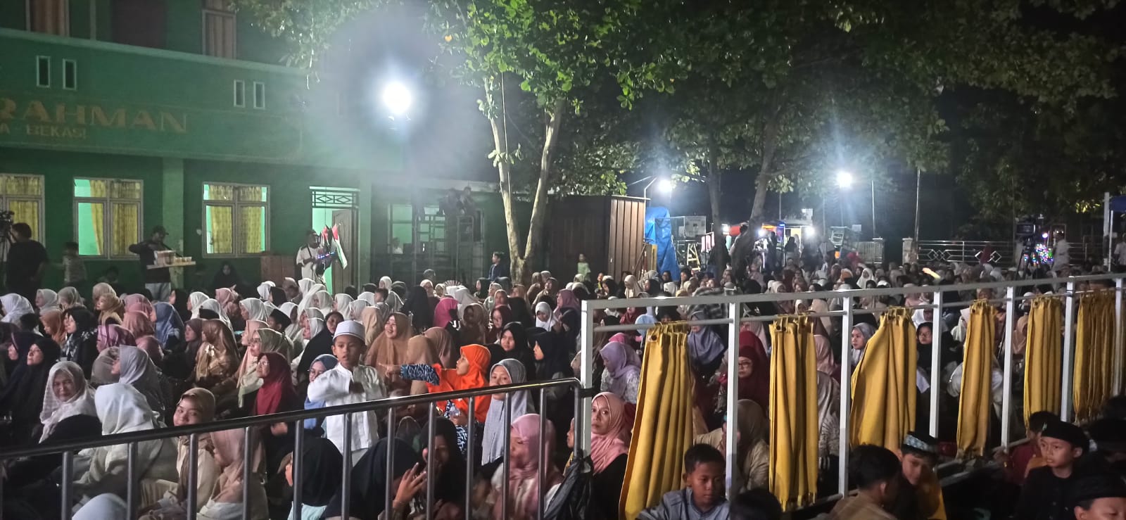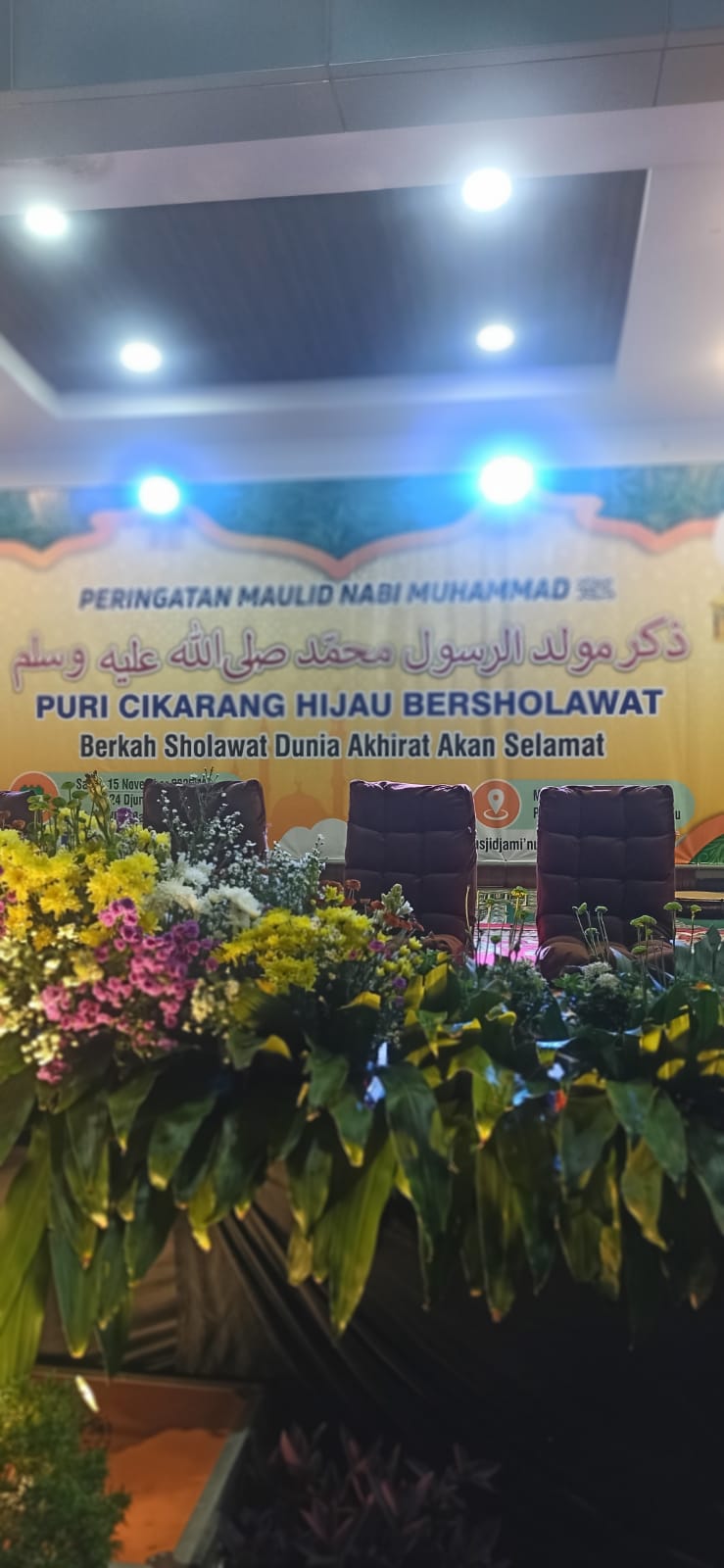 Lampu-lampu memantulkan cahaya kuning yang ramah, dekorasi islami terpasang rapi—semuanya menjahit suasana teduh yang membuat hati otomatis merunduk khusyuk.