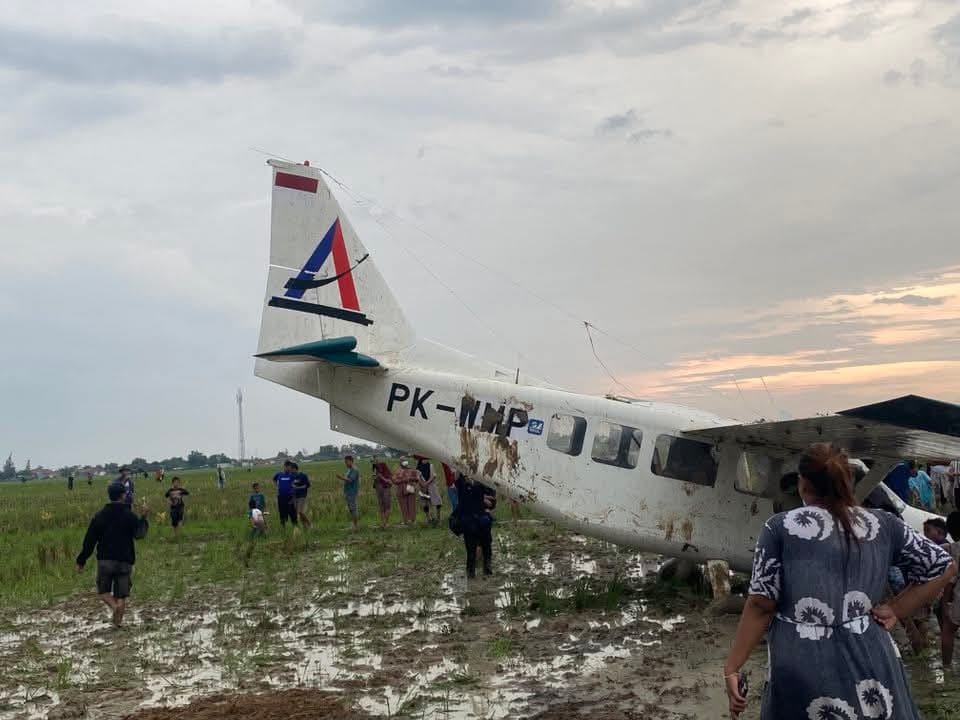 Pesawat latih Cessna PK-WMP milik BRO Skydive Indonesia melakukan pendaratan darurat di persawahan Dusun Sampora, Desa Kutaraharja, Kecamatan Tirtamulya.