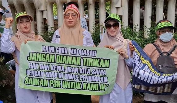 “Guru madrasah juga guru bangsa. Jangan biarkan pengabdian kami tak dihitung oleh negara,” seru seorang orator dari atas mobil komando.